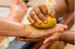 C’est une technique très agréable. Elle consiste à masser les pieds avec du beurre clarifié « le ghee », à l’aide d’un petit bol doré qui a de nombreuses vertus et qui est constitué d’un alliage de cinq métaux dont les principaux sont, le Cuivre, le Zinc, et le Bronze. Il atténue la nervosité, l’angoisse et la colère. Ce massage touche les points réflexes du pied, il aide entre autres à améliorer la santé des yeux, il peut éliminer des insomnies, il apporte calme et bien-être.